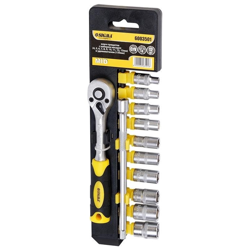 Набір головок Sigma торцевих 1/4" + ключ-тріскачка та подовжувач 12шт CrV (6003501) 6003501