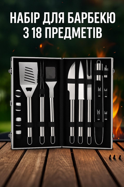Набір для барбекю з 18 предметів у металевій валізі з нержавіючої сталі, довгі інструменти 41 см, стильний кейс для гриля, м