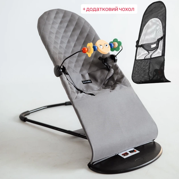 Шезлонг-гойдалка Love Baby для немовлят, сірий + дуга з іграшками, чорний чохол у комплекті