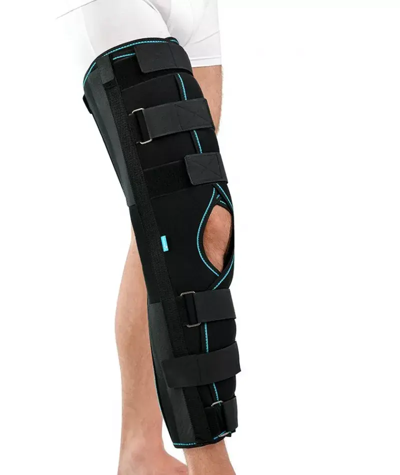 Ортез на колінний суглоб ортопедичний, із поліцентричними шарнірами, роз’ємний, ТМ «Алком», арт. 4033, призначений для іммобілізації колінного суглоба. Забезпечує сильний ступінь фіксації, бокову стабілізацію колінного суглоба. Виріб виготовлений із неопрену — міцного пружного матеріалу на каучуковій основі з вираженими теплозберігаючими властивостями. При цьому додаткового зігрівального ефекту матеріал не надає та зберігає виключно тепло, що виділяється тілом людини.