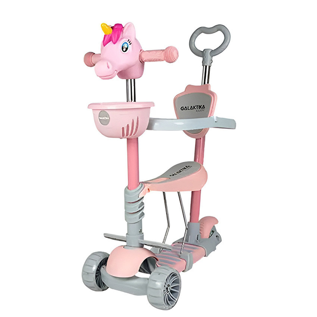 Дитячий триколісний самокат 5в1 з підсвічуванням, кошиком та батьківською ручкою Galaktika Єдиноріг Рожевий