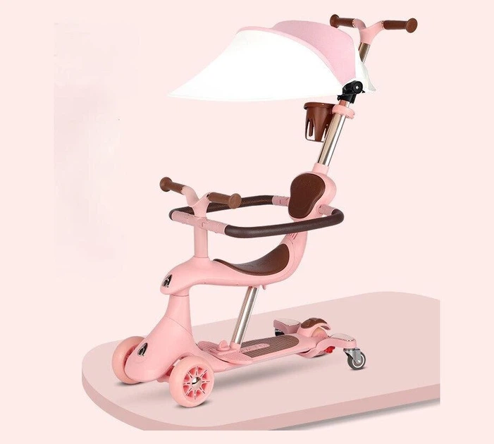 Дитячий 5-в-1 самокат JR 3-108, рожевий, з батьківською ручкою, світлом, музикою, м’якою накладкою