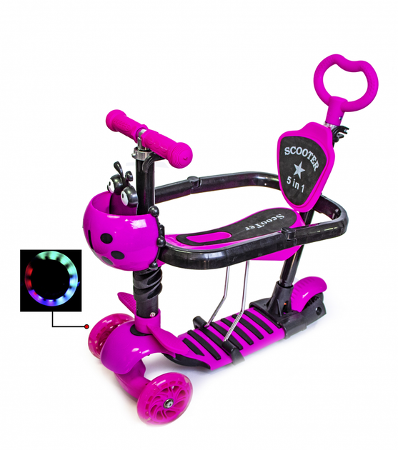 Дитячий триколісний самокат Scooter Божа корівка 5 в 1 з бортиком, сидінням і батьківською ручкою, Pink
