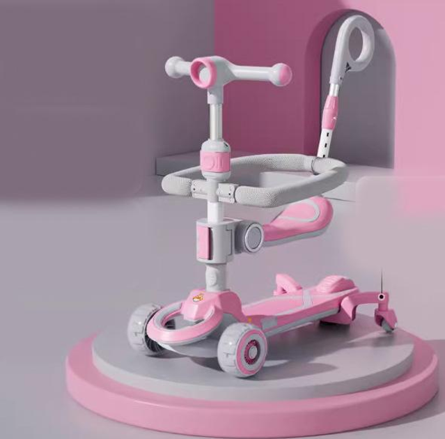 Дитячий самокат - трансформер 6 в 1 з бортиком підсвічуванням коліс та деки Dino музика бічні колеса рожевий