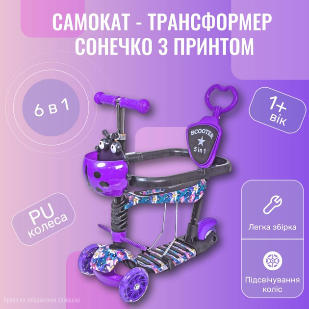 Дитячий самокат - трансформер 6 в 1 з підсвічуванням і бортиком Scooter Сонечко Violet