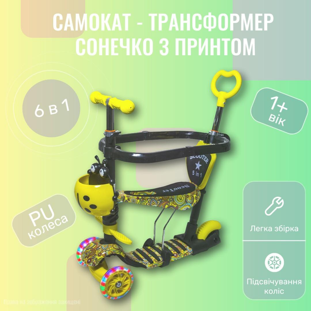 Дитячий самокат - трансформер 6 в 1 з бортиком та підсвічуванням Scooter Сонечко жовтий