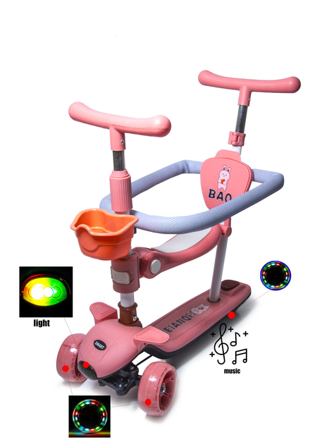Дитячий самокат - трансформер 6 в 1 з бортиком підсвічуванням коліс та деки BAQ музика бічні колеса рожевий