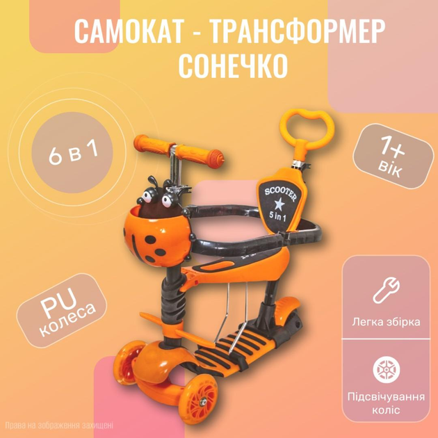 Дитячий самокат - трансформер 6 в 1 з бортиком та підсвічуванням Scooter Сонечко помаранчевий