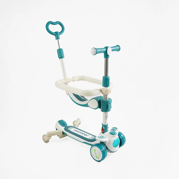 Самокат 5 в 1, зелений, метал + пластик, музика, світло, батьківська ручка, 3 положення