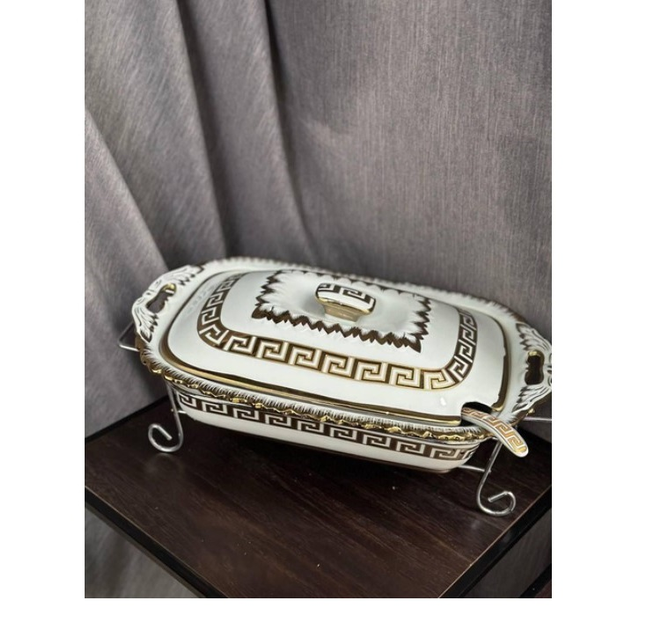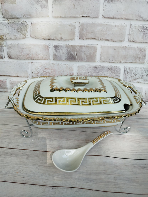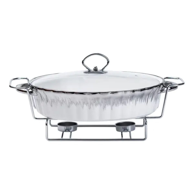 Керамічний овальний марміт із підігрівом 1.5 літра на металевій підставці білий