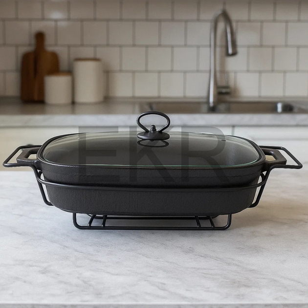Марміт овальний 3,5л 43*26,5*12см скляна кришка + метал.підставка чорний 6430 KAMILLE