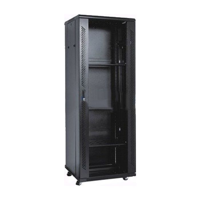 Комутаційна шафа, розбірна, з дверцятами; максимальне статичне навантаження 1000 кг; шафа зачиняється на замок, ключі у комплекті; товщина: вертикальні монтажні рейки – 2.2 мм, монтажна балка – 1.7 мм, бічна панель – 1 мм, передні дверцята – 1.4 мм; задні дверцята – 1.2 мм; рама – 1.2 мм; габаритні розміри: ширина 600 мм, глибина 600 мм, висота 32U – 1610 мм; клас захисту захисту IP20; у комплекті ніжки та коліщатки для зручного переміщення; шафа поставляється в розібраному вигляді у 4 коробках; колір чорний; вага (брутто) 65.2 кг