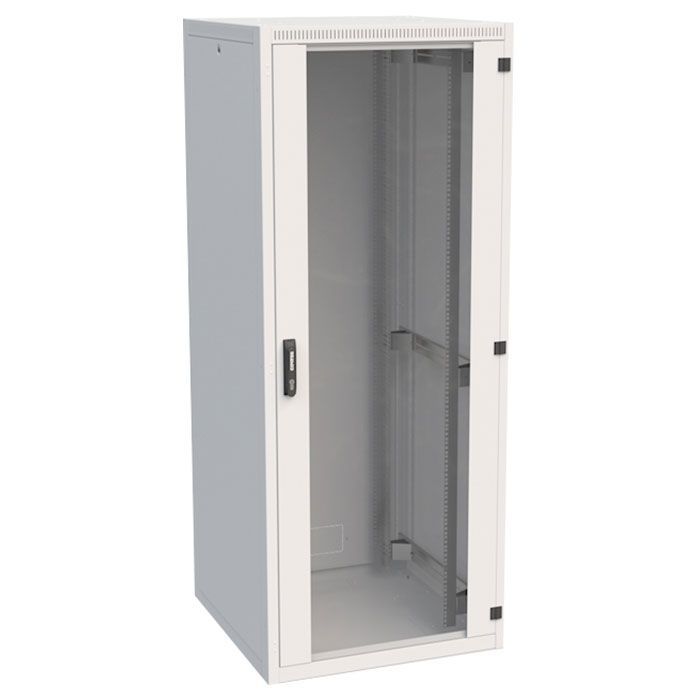 Шафа серверна з перфорованими дверима. Постачається у розібраному вигляді. Комплект постачання: Розбірна опорна рама із встановленими знімними бічними стінками із замками; Передні двері перфоровані 63% із замком з ручкою; Задні двері сталеві розстібні, перфоровані 63%, із замком з ручкою. Дві пари монтажних профілів на відстані 19" з маркуванням юнітів та з можливістю регулювання