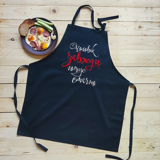 Фартух кухонний чоловічий з вишивкою «Чоловік завжди готує смачно» чорний (0451)