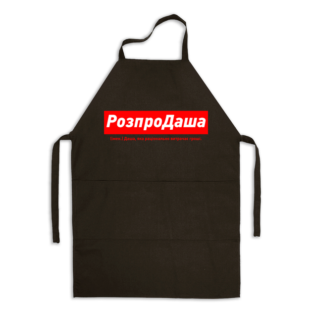 Фартух чорний габардиновий іменний з написом «РозпроДаша. Даша яка раціонально витрачає гроші»