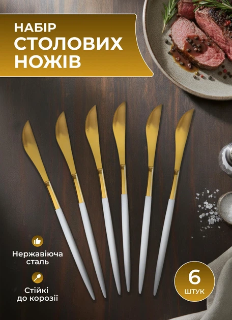 Набір столових ножів 6 штук з нержавіючої сталі 22,5 см білі із золотом для сервірування столу сервірувальні ножі (524314)