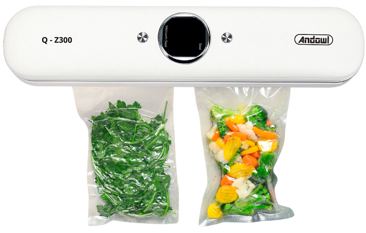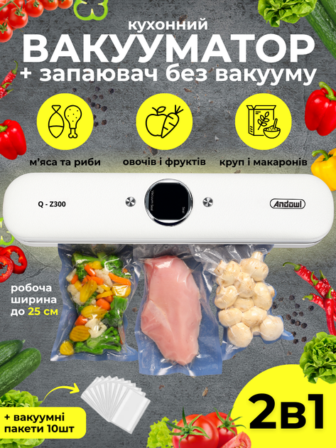 Вакууматор запаювач 2в1 кухонний домашній Andowl Q-Z300X1 білий побутова машина 60кПа для вакуумного пакування та запаювання