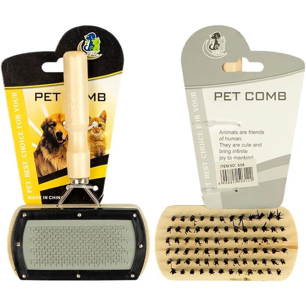 Щітка пуходерка + гребінець для вичісування шерсті котів та собак двостороння з дерев'яною ручкою Набір 2 шт