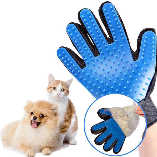Рукавичка для вичісування шерсті котів та собак True Touch Чорно-синя на праву руку