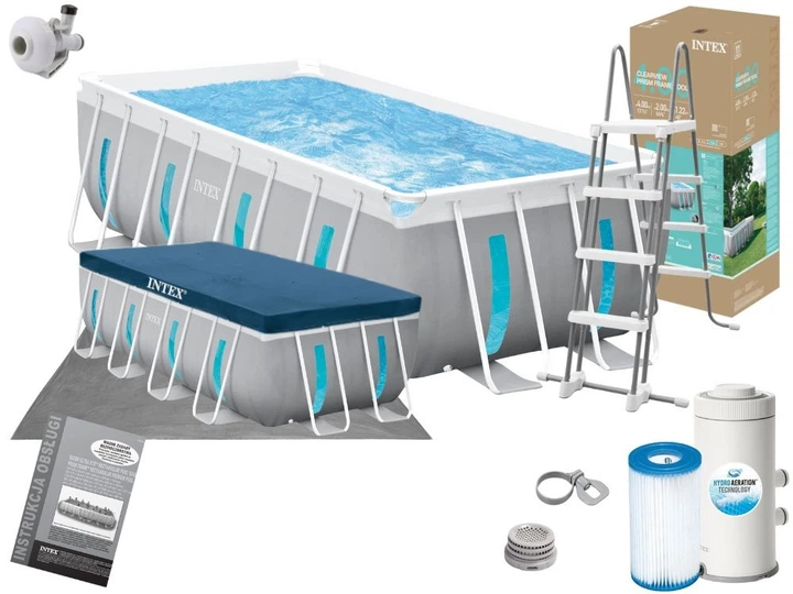 Каркасний басейн Intex 26746 (122*488 см., об'єм: 19176 л., картриджний фільтр-насос: 5678 л/рік, підстилка, стремянка, тент