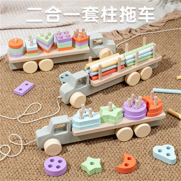 Каталка C 74856 “Вантажівка”, різнокольорові елементи, колеса, геометричний сортер, дерев'яний, веревочка, у коробці