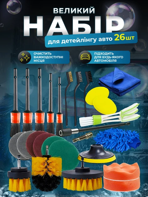 Великий мульти набір для авто детейлінга 26в1 Комплект щіток та інструментів для детального чищення миття автомобіля зовні т