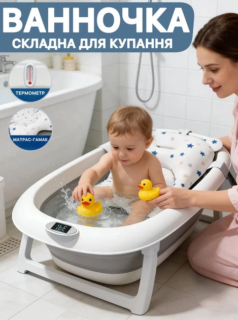 Ванночка дитяча складна з матрациком для купання, з термометром, та зливом, для новороджених та немовлят