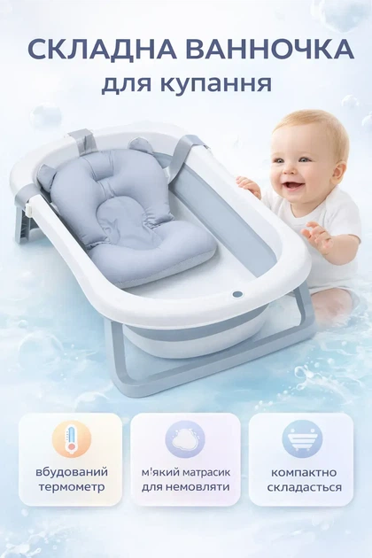 Ванночка дитяча складна з матрациком для для купання, з термометром, та зливом, для новороджених та немовлят від 0 до 2.5р.