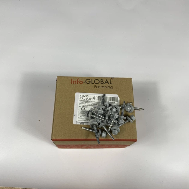 Покрівельні саморізи Info-Global 4,8х35 мм RAL 9006 Біло-алюмінієвий, металік по дереву (250 шт.) з гумовою шайбою EDPM для