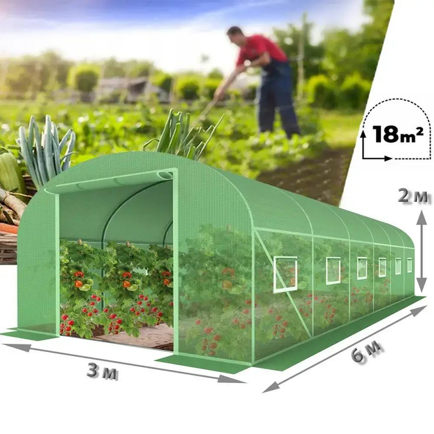 Теплиця парник 18 м (632 м) з оцинкованим каркасом і тришаровою армованою плівкою 140 г/м з УФ-захистом, 12 вікон, двері на