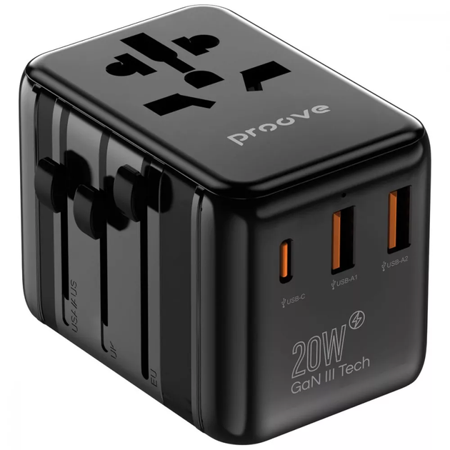 Універсальний адаптер Proove Trip 20W, вогнестійкий пластик, 2500 Вт, Type-C+2xUSB+AC, Чорний