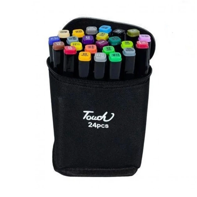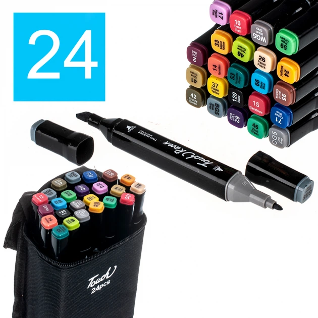 Набір двосторонніх скетч маркерів 24 штук Touch Cool, на спиртовій основі, чорний корпус у сумці