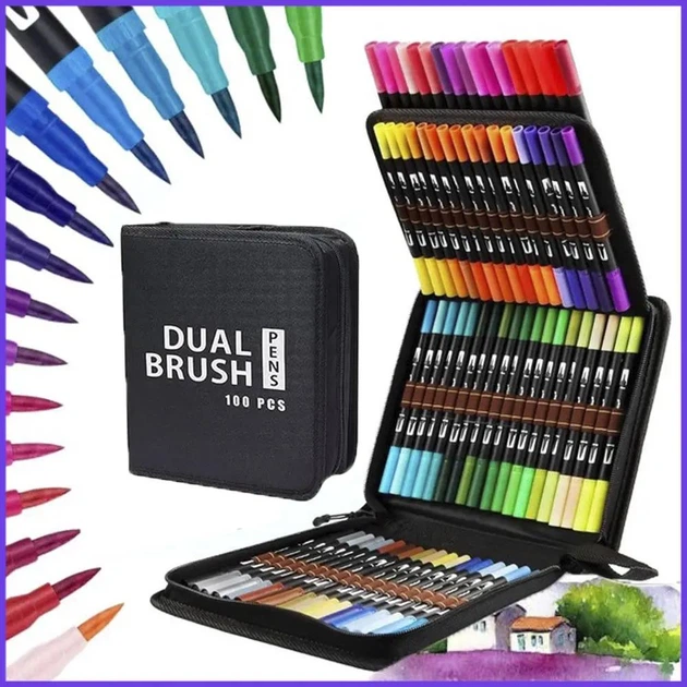 Набір акварельних двосторонніх скетч-маркерів для малювання Dual brush, 100 шт, професійні фломастери для художників у чохлі