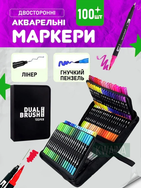 Набір акварельних скетч маркерів 100 кольорів на водній основі з двома наконечниками лінер-пензель для малювання в кейсі.