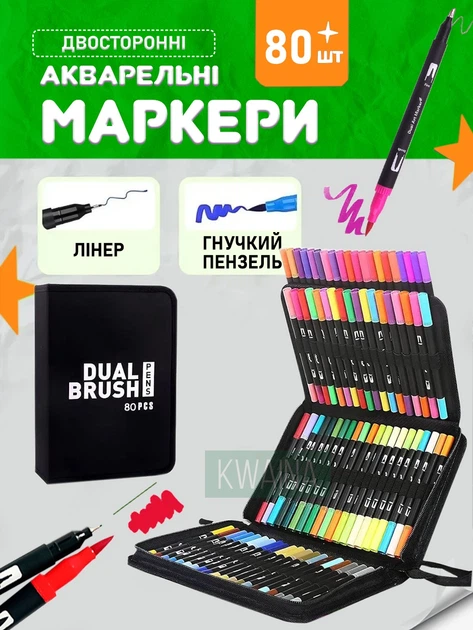 Набір акварельних скетч маркерів 80 кольорів на водній основі з двома наконечниками лінер-пензель для малювання в кейсі.