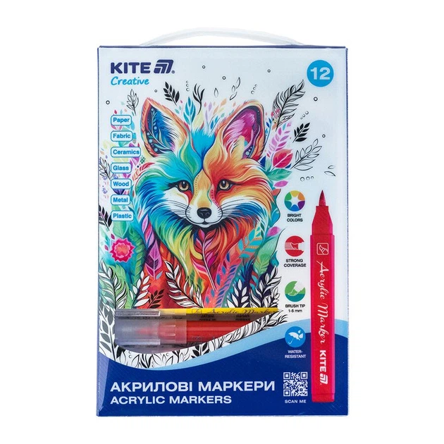 Набір акрилових маркерів-пензликів Kite Creative 1-5 мм 12 кольорів (K-1159)
