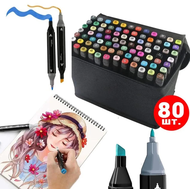 Набір (80 шт) фломастерів двосторонніх, маркер ескізу, в сумці - маркери для скетчингу та малювання - 80 кольорів