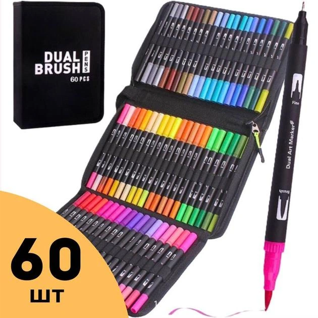 Скетч маркери фломастери акварельні двосторонні Набір 60 штук у чохлі на блискавці