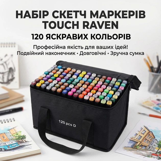 Набір маркерів двосторонніх для малювання скетчингу Touch Raven 120 шт комплект дитячі кольорові двосторонні скетч фломастер