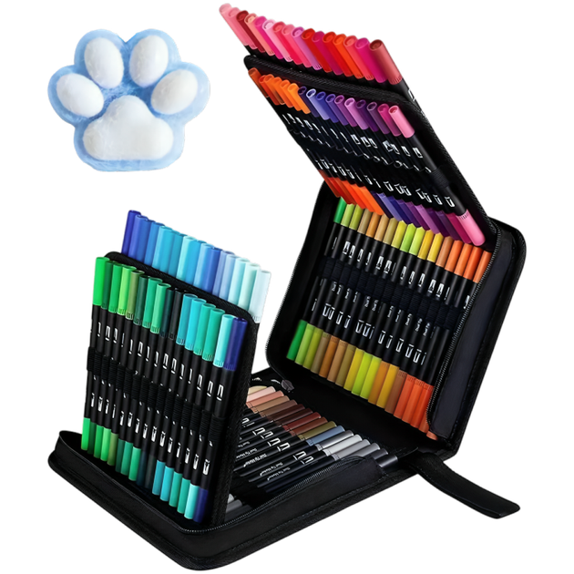 Комплект набір двосторонніх акварельних скетч маркерів у чохлі 100 штук з іграшкою сквішем лапкою котика рандомного кольору