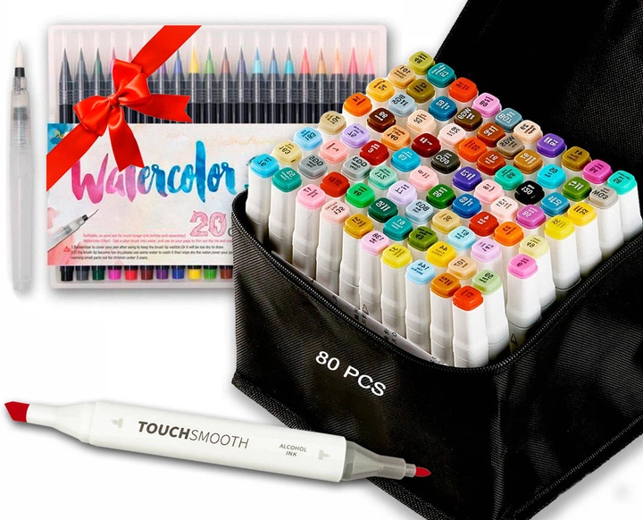 Набір двосторонніх маркерів Touch Smooth на спиртовій основі 80 шт + 20 шт маркерів для скетчинга з пензликом