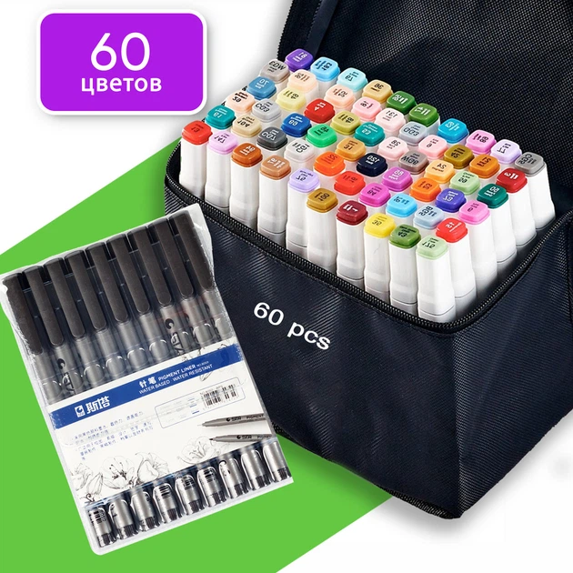 Маркери двосторонні Touch 60 кольорів і набір лайнерів 9 шт для ескізів і скетчів, набір фломастерів топ