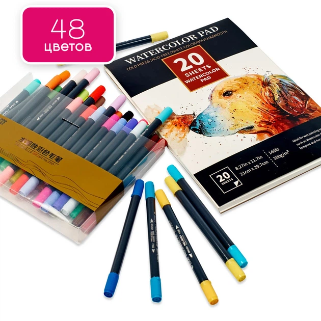 Набір для скетчів двосторонні акварельні маркери STA 48 шт та акварельний папір для скетчингу 20 аркушів