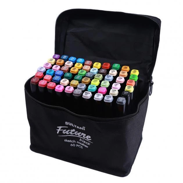 Набір двосторонніх скетч маркерів на спиртовій основі 60 штук чорний корпус у сумці