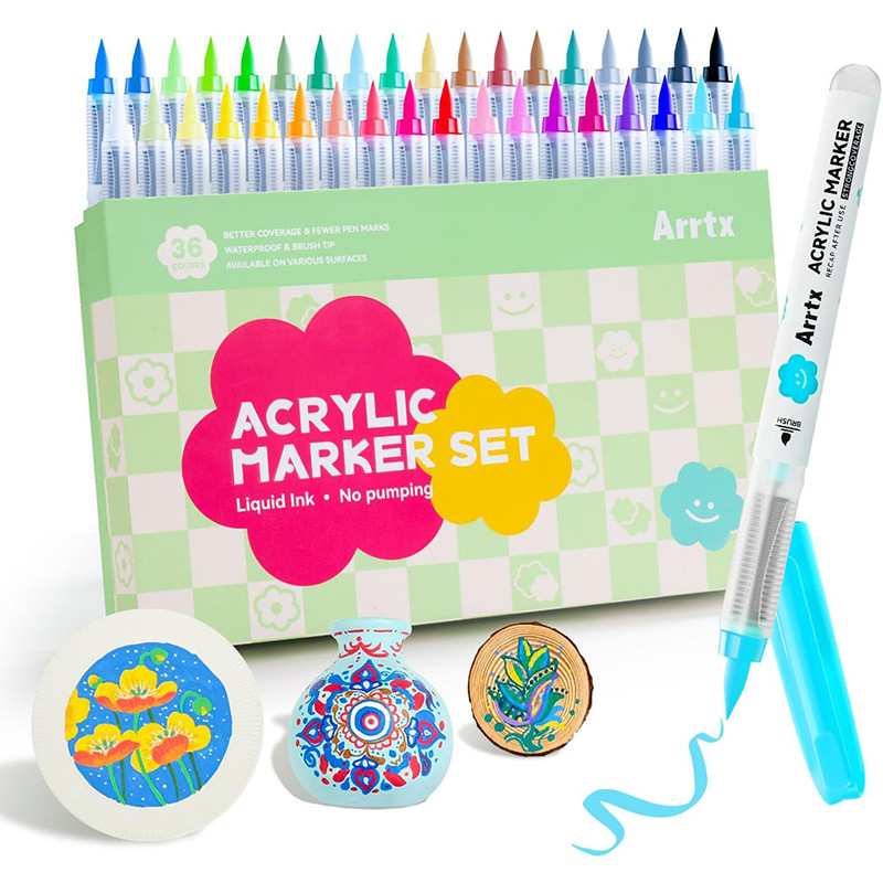 Акрилові маркери Arrtx AACM-0530A 30 кольорів для наскельного живопису, кераміки, скла, дерева та багато іншого. Особливості акрилових ручок Arrtx: - 30 яскравих кольорів: Завдяки різноманітності кольорів на вибір, у вас буде більше можливостей для творчості. Набір маркерів Arrtx із 30 штук - ідеальний вибір для будь-якого художника. - Пензлевий наконечник акрилового маркера: Професійні