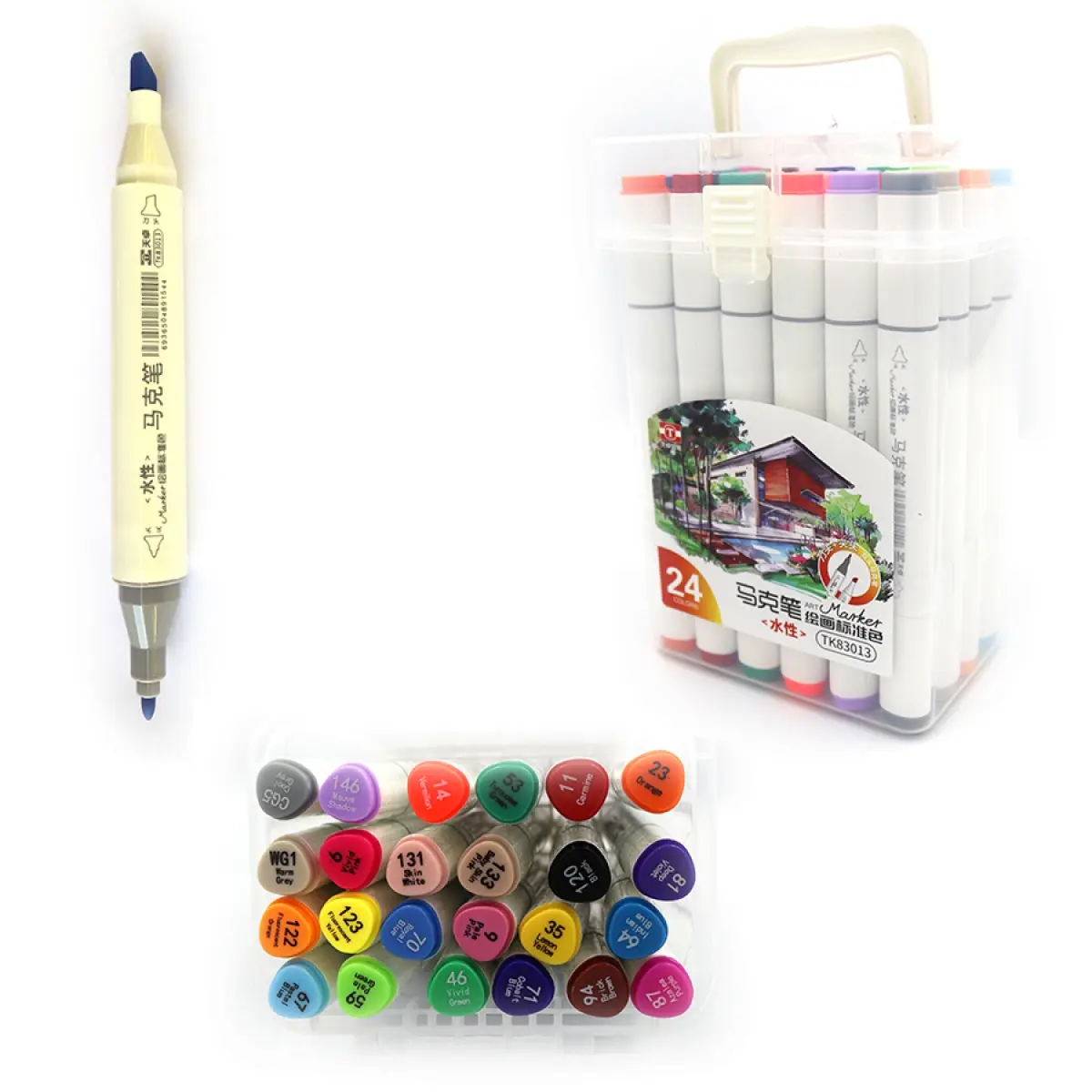 Набір акрилових скетчмаркерів двосторонніх Aodemei, трикутний корпус, м’який+твердий, 24 шт., пластиковий бокс