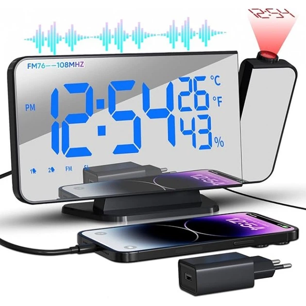 Дзеркальний настільний годинник з проекцією часу на стелю Gaosiio DS-3618LP від USB, зелене підсвічування, червоний
