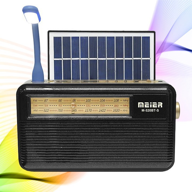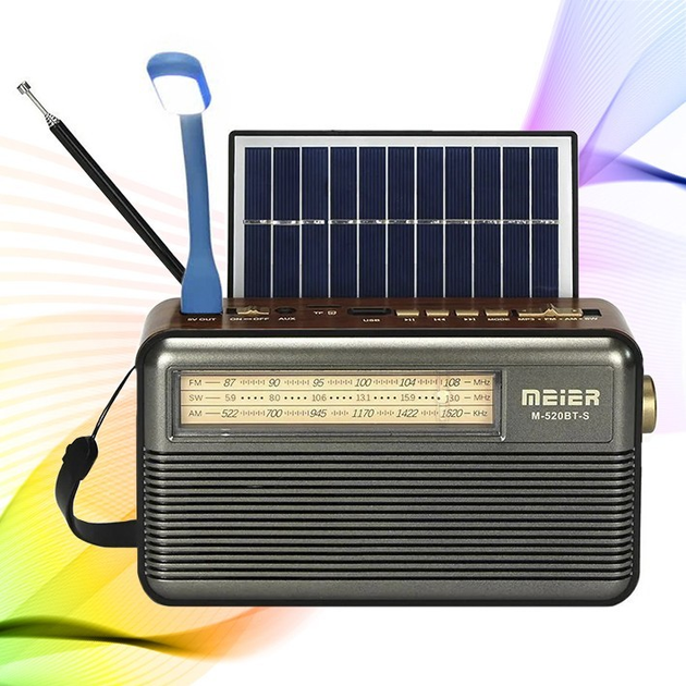 Портативний FM радіоприймач МЕІЕR МD 52О BT FM радіо програвач з флешкою USB на акумуляторі з сонячною батареєю з ліхтариком