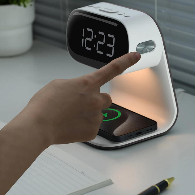 Годинник настільний з функцією бездротової зарядки для смартфону та підсвічуванням, бездротова зарядка з годинником Білий HM