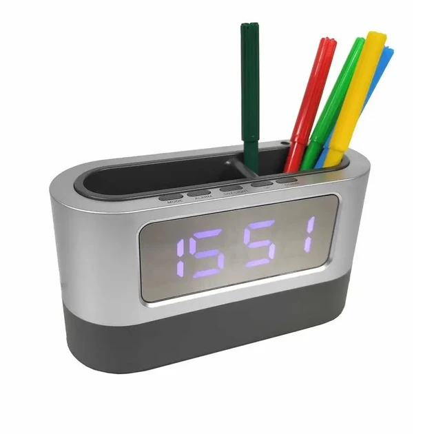 Годинник настільний 038 з підставкою для ручок працює від мережі та батарейок сірий